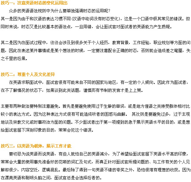 很多畢業(yè)生都有這樣的經(jīng)歷,當(dāng)進(jìn)入面試階段有可能會遭遇英文面試,不過這也預(yù)示著你夢想的職位正向你招手,這輪面試的份量可想而知,所以你應(yīng)該確保在面試中發(fā)揮最佳狀態(tài)。英文交流無障礙的應(yīng)聘者為數(shù)不多,大多數(shù)人都處于有一定交流基礎(chǔ)、但經(jīng)驗(yàn)不足的水平,現(xiàn)在介紹一些面試中的技巧及例子,希望幫助英文水平并不是特別出眾的你。